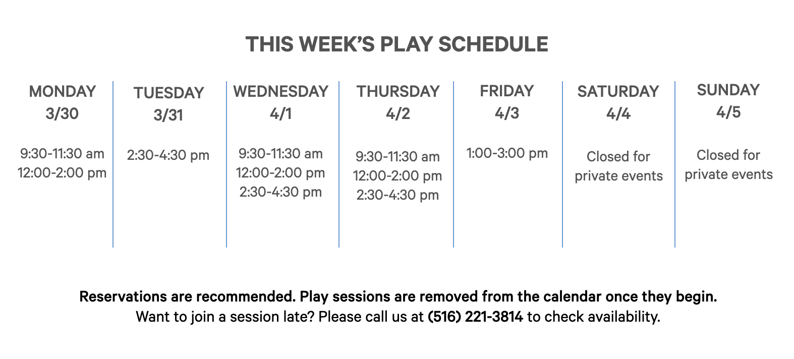 As a reminder, everyone must wear socks to enter the play area and there is parking in the back.